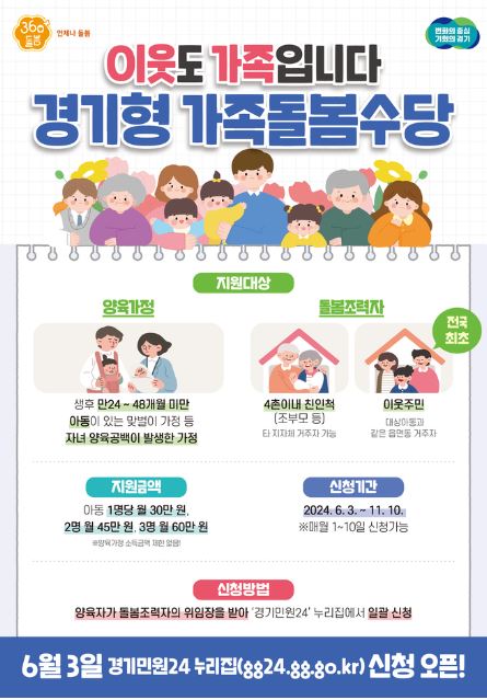 경기형 가족돌봄수당은 육아로 인한 심신의 피로, 조부모의 무상 돌봄 노동, 과다한 민간 돌봄 비용지출이 증가하는 만 24~48개월 미만 아동 양육자를 대상으로 소득 기준 없이 월 40시간 이상 친인척 또는 이웃 주민이 돌봄을 수행했을 경우 돌봄수행자에게 비용을 지원하는 사업입니다.